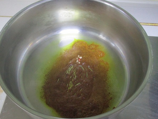 4.湯鍋里倒入1茶匙油,溫油用小火把咖喱粉倒入炒出香味,這一步很關鍵,不要開大火,不然會有焦糊味的
