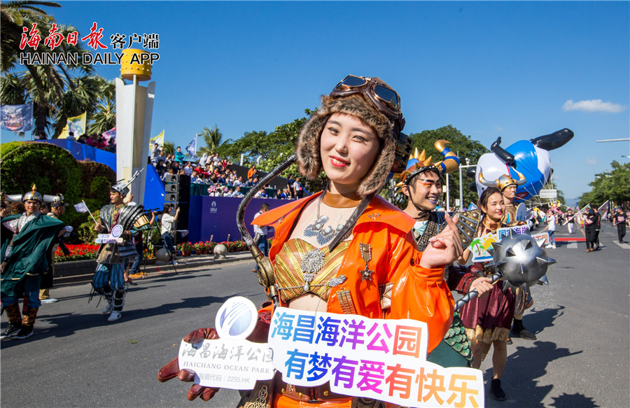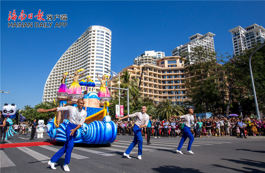 緊隨其后,志愿者方陣、青春街舞方陣、炫動三亞花車與絲路情長花車方陣、吉祥人偶方陣、黎族苗族舞方陣、電音章魚花車與重型機車方陣陸續出場,沿著三亞灣從海月廣場一路走向鳳凰島入口。