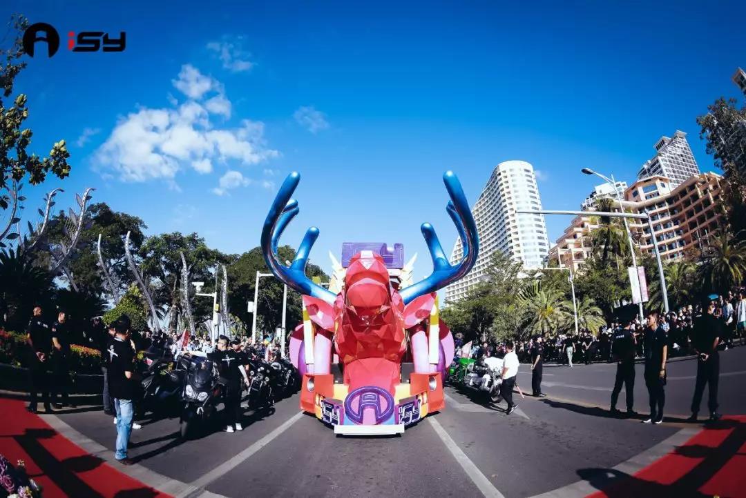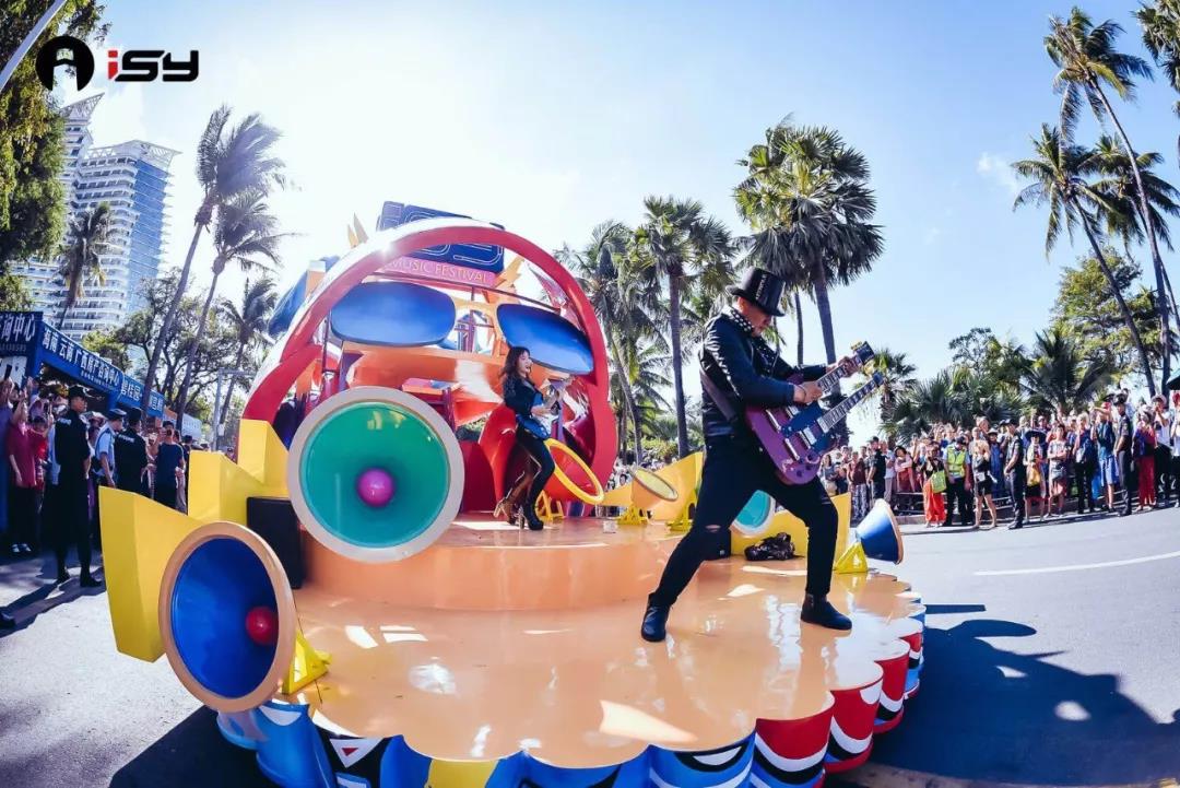三亞別稱“鹿城”,主花車形象也是因其美好的愛情傳說塑造而成,它昂首嘶鳴,霸氣的鹿角展示出了它內在的力量與氣勢。搭配耳機、音響、舞臺等潮流音樂元素,使其不脫離ISY的音樂本質。