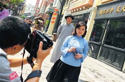 ?一對(duì)情侶在電影公社拍攝民國(guó)風(fēng)的照片。 本報(bào)記者 張杰 攝