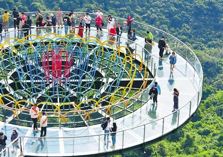 ↑游客在亞龍灣熱帶天堂森林旅游區全海景玻璃棧橋游覽。武威 攝