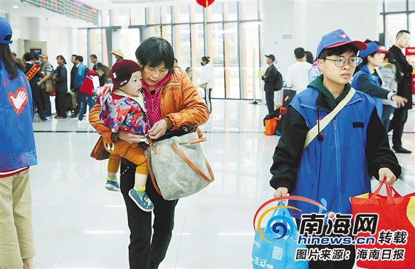 ?1月21日上午,志愿者在海口汽車客運總站售票廳幫助旅客提行李。海南日報記者 蘇曉杰 通訊員 潘彤彤 攝
