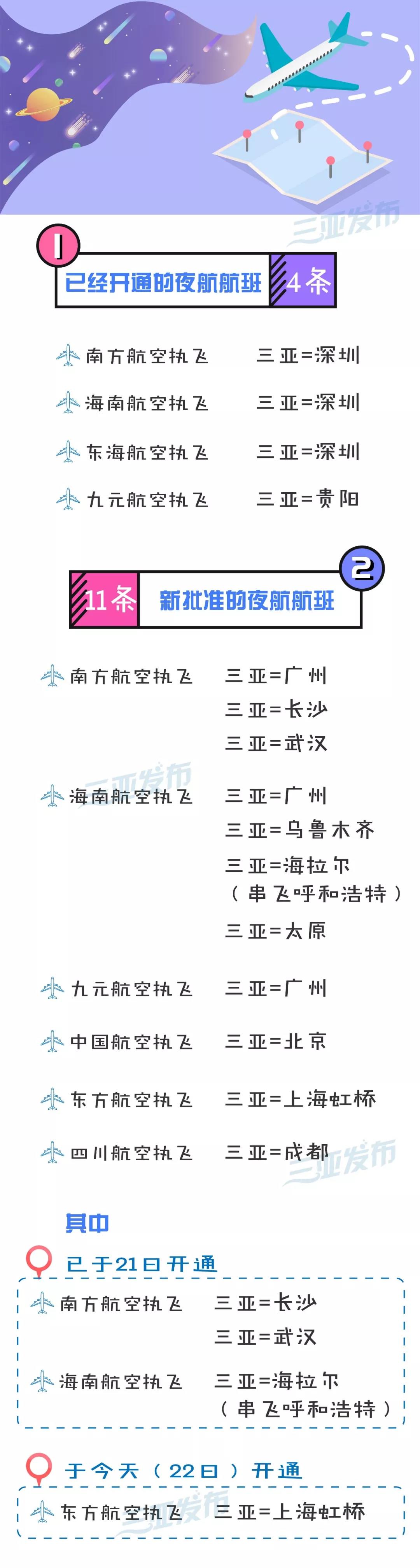 民航局批準的11條加班航線包括海南航空4條,南方航空3條,中國航空、東方航空、四川航空、九元航空各1條。所有加班航線均為每天1班。春運首日,三亞已開通3條加班航線,其余8條航線將陸續開通,加入三亞航空春運保障,滿足春運期間旅客進出三亞需求。