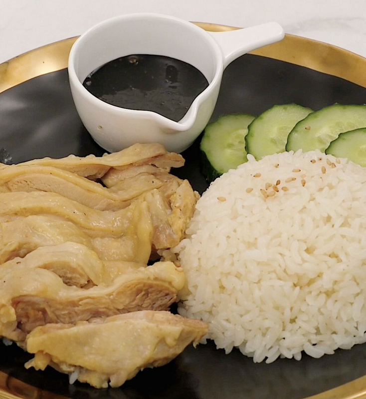 3 飯煮好以后,取出雞腿切塊兒,配著醬汁一起食用。