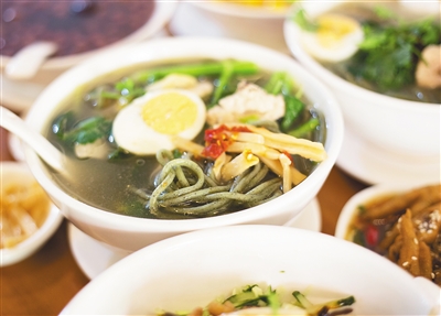 說(shuō)起雞屎藤,人們熟悉的吃法是做成粑蒸熟,或是搓成橄欖狀的球入甜湯。在儋州有這么一家“網(wǎng)紅店”,卻做出了雞屎藤面,使得雞屎藤不僅可以做成小吃甜品,還能成為三餐的主角。