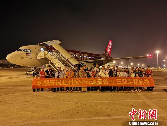 ?亞洲航空3月7日凌晨在三亞鳳凰國際機(jī)場舉行迎接儀式,慶祝該司曼谷直飛三亞定點(diǎn)直飛航線首航。亞洲航空供圖