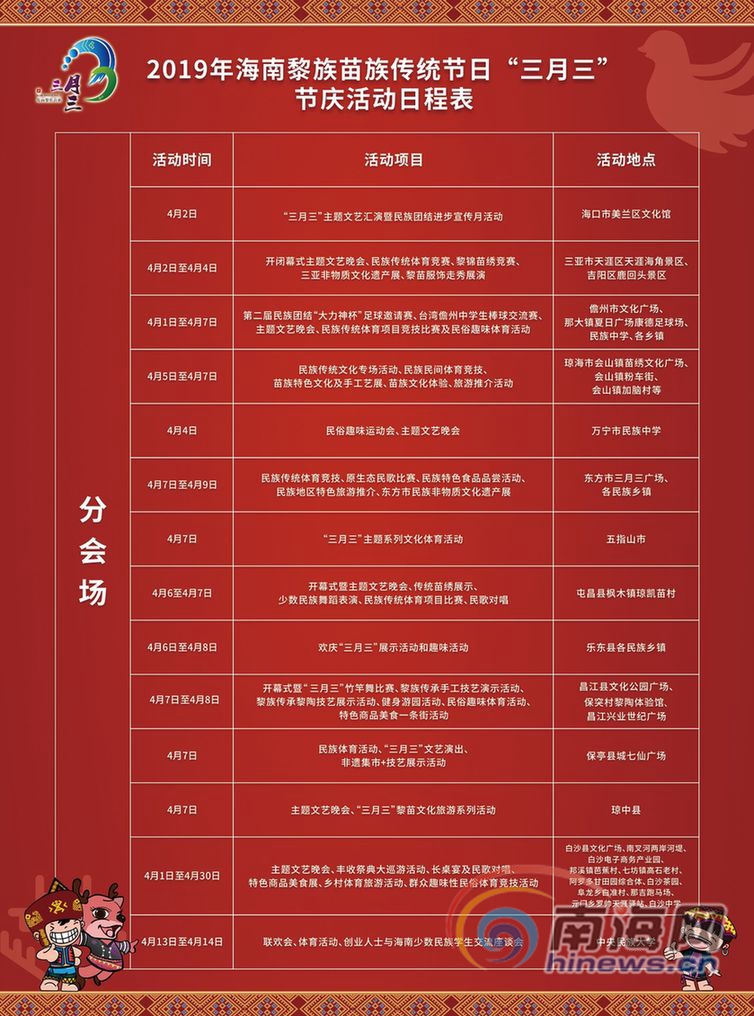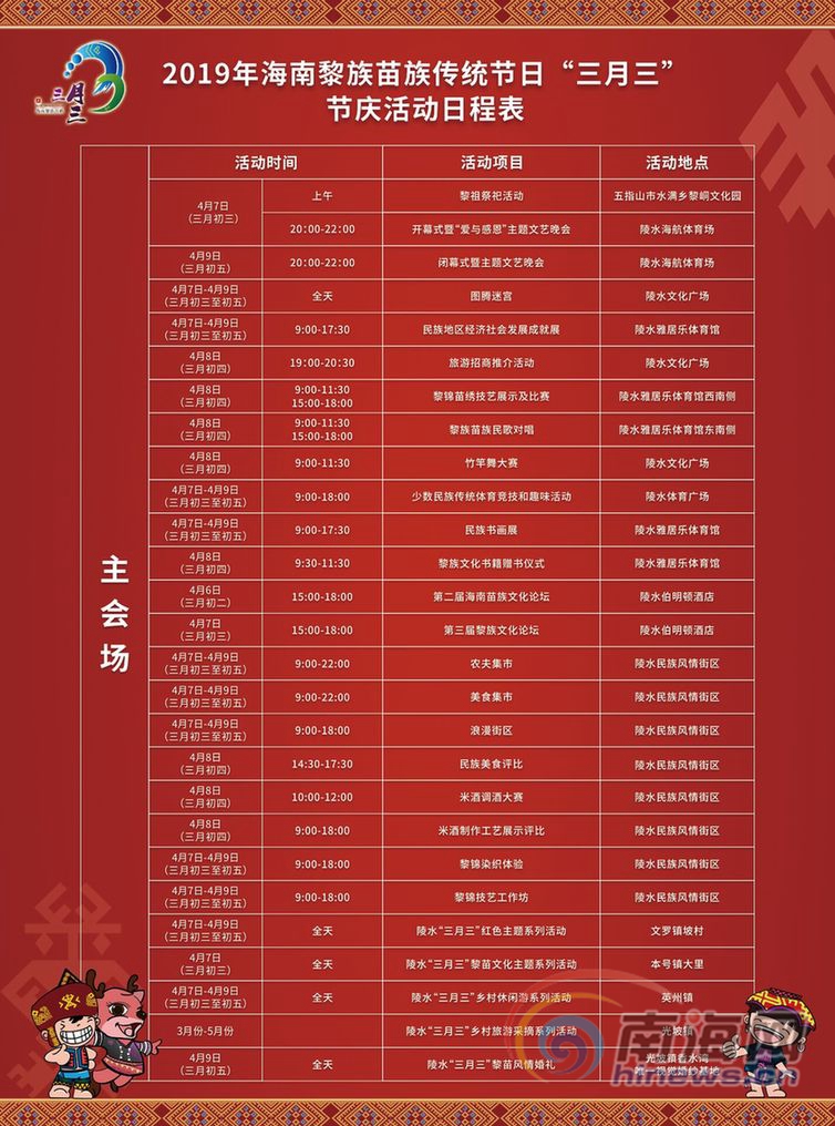 南海網、南海網客戶端海口3月20日消息(南海網記者 陳麗娜)3月20日上午,南海網記者從2019年海南黎族苗族傳統節日“三月三”活動新聞發布會上獲悉,今年的“三月三”以“愛與感恩”為主題,主會場活動將于4月6日至4月9日在陵水黎族自治縣和五指山市舉辦,另外13個市縣也將舉辦豐富多彩的分會場活動。