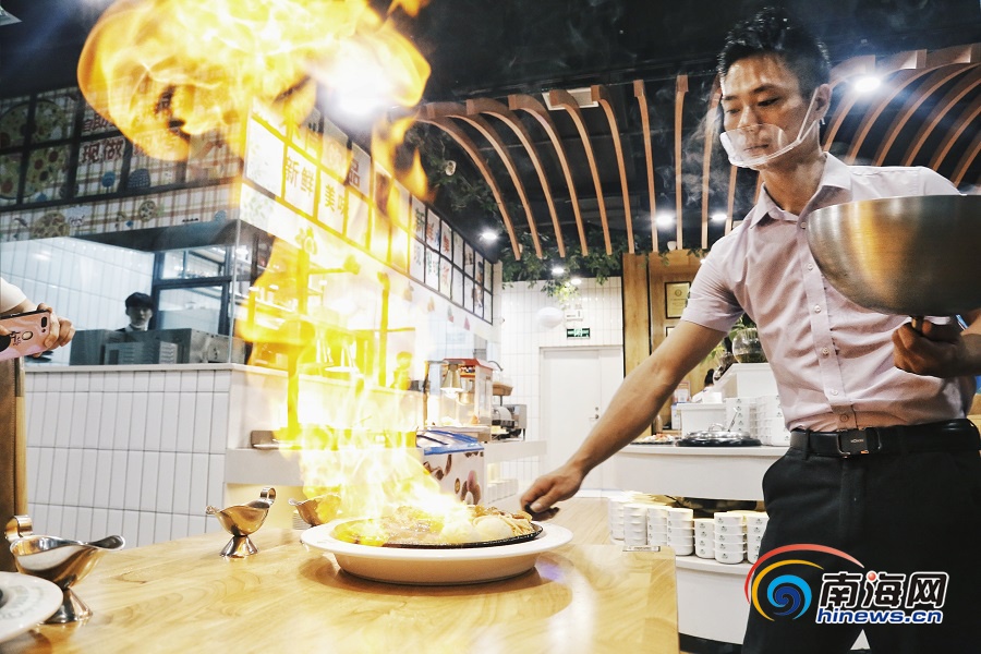 師傅點(diǎn)上火,火焰躥上40厘米高,一道美味的火焰牛排隨之制成。南海網(wǎng)記者 姚皓 攝