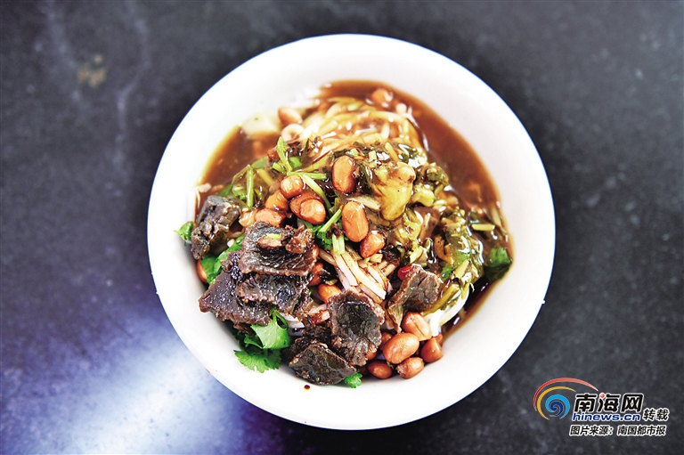 天色剛亮,定城的陳記潭欖腌粉店就迎來過往食客,食客悠閑地點上一碗定安腌粉,定安人的一天從味蕾的滿足開始。店門口的透明櫥窗里,腌粉配料整齊地一字排開,瓷白的碗里放入一綹米粉,店主嫻熟地將花生、黑豬肉干或牛肉干、特制醬汁、酸菜等配料加入米粉中,再淋上一勺黑褐色的鹵汁,澆上一小勺花生油,撒上香菜和香蔥。