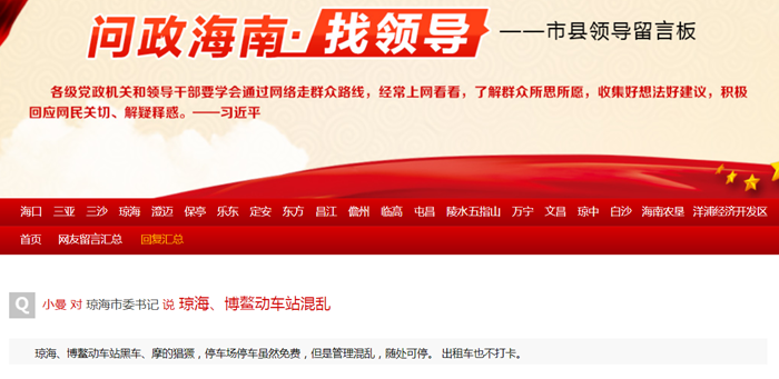 點(diǎn)擊進(jìn)入“問政海南·找領(lǐng)導(dǎo)”欄目暨南海網(wǎng)民心直通車——海南市縣領(lǐng)導(dǎo)網(wǎng)友留言板