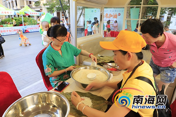 市民紛紛在粽子工坊體驗親手包粽子。南海網記者 黃祥 攝