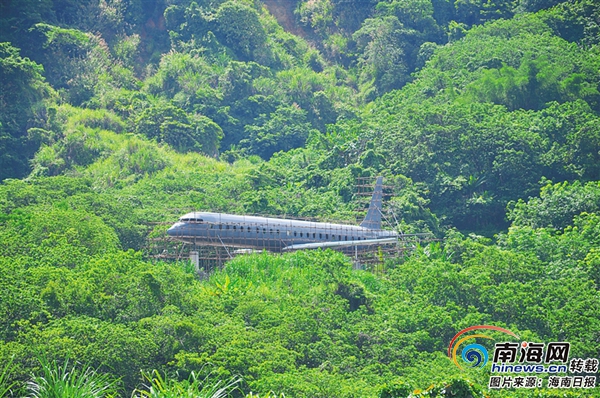 有飛行情結的游客有沒有想過能住進一家像飛機的酒店里?海墾旅游集團積極創新發展思路,努力打造領先、創新型景區景點。圖為該集團位于儋州南部的蓮花山景區正在建設中的飛機酒店,該機“機身”由水泥澆筑,長38米、內中心寬3.5米、內中心高2.6米,計劃在上面設置4間-5間套房。