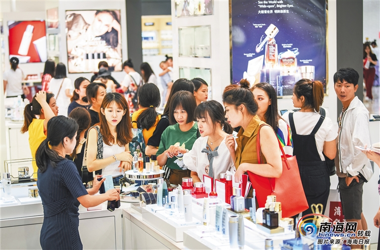 6月16日,海口市國興大道日月廣場免稅店內,各類商品琳瑯滿目,吸引眾多消費者前來選購。海南正在實施的更加開放便利的離島免稅購物政策,對消費者產生了巨大吸引力。