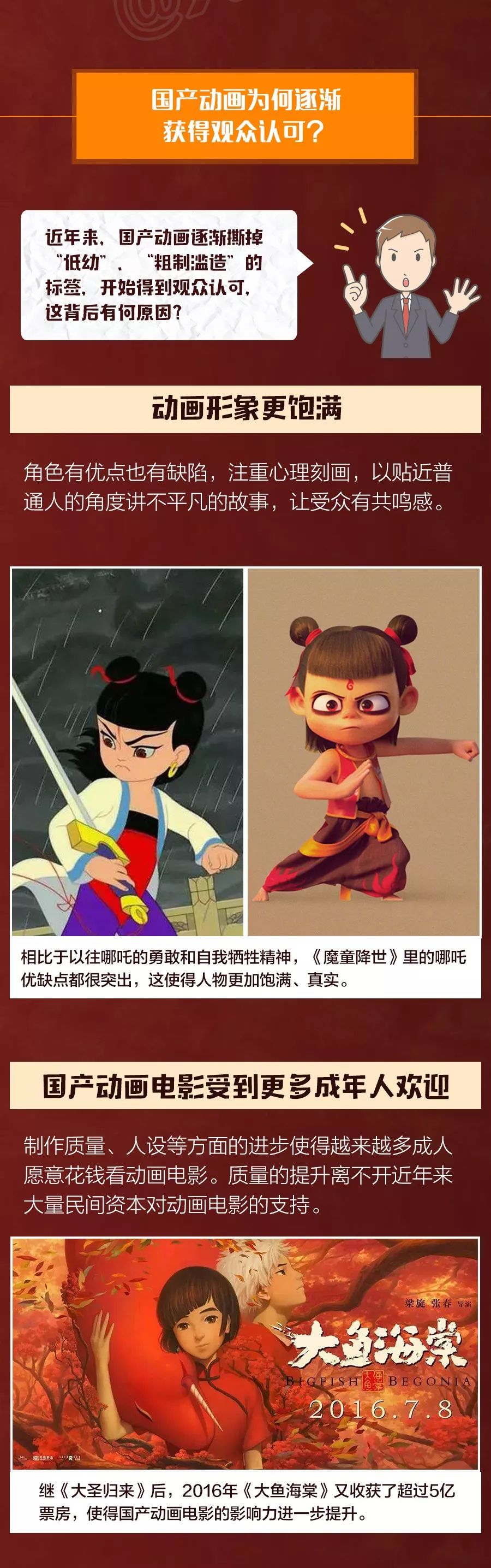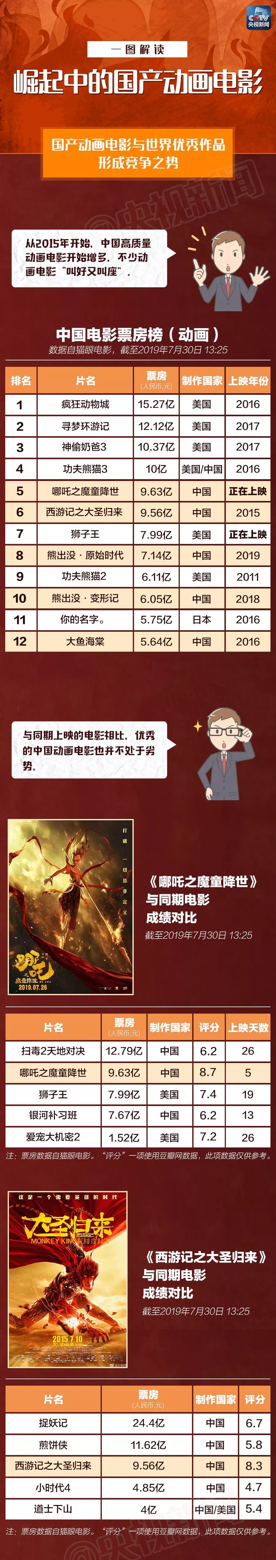 《西游記之大圣歸來》和《哪吒之魔童降世》這類國產動畫電影為何能獲得觀眾認可?國產動畫電影近年來的成績如何?中國動畫電影在哪些方面仍有不足?一張長圖,帶你了解↓↓↓