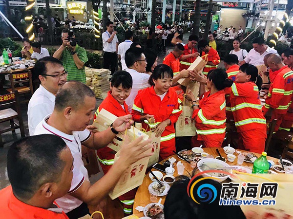 現場環衛工人獲贈月餅。南海網見習記者 鐘瑜 攝