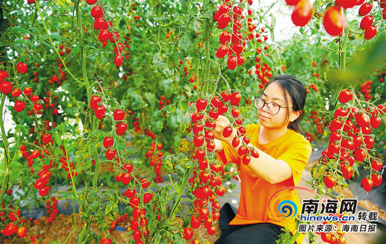 海南和豐世紀農業開發有限公司育苗中心試驗大棚內,技術員在觀察小番茄長勢。海南日報記者 蘇曉杰 通訊員 楊耀科 攝