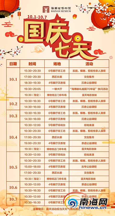 在國(guó)慶假期期間,海南省博物館將舉辦豐富的展覽,其中“奮斗新時(shí)代美好新海南——新中國(guó)成立70周年海南發(fā)展成就展”,展現(xiàn)海南自新中國(guó)成立以來(lái)的巨大改變,展望未來(lái)發(fā)展的美好前景,展出時(shí)間從即日起持續(xù)至2020年5月31日;“獻(xiàn)禮祖國(guó)70華誕”快閃活動(dòng)將于10月1日19時(shí)10分-20時(shí)05分舉辦;屆時(shí)還將舉辦“中國(guó)夢(mèng)·黎家情”黎錦捐贈(zèng)儀式、海南省博物館獻(xiàn)禮祖國(guó)史詩(shī)朗誦、全體觀眾大合唱、鋼琴獨(dú)奏、瓊歌瓊舞《黎族+近代+紅色娘子軍》等活動(dòng)。