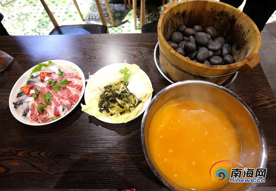 “我們木桶魚最大的特色,現做現吃,保持魚的新鮮。”王弟說,為了讓客人喝到最鮮美的魚湯,他會先在木桶里放入380度的石頭,再把生魚和配菜放進木桶里,最后倒湯。通過高溫石頭把魚煮熟,僅2分鐘就可以開吃。他覺得,這樣做出來的木桶魚食材新鮮,味道鮮美可口,適合各個年齡段的人群。