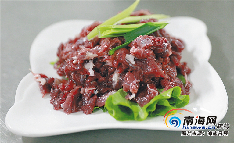 在定安縣城“牛肉一條街”開牛肉檔口的老莫,一天要賣四五百公斤牛肉。他的肉檔案板上,一塊塊牛肉還在“跳動”。老莫認為,仙溝牛肉最大的賣點就是鮮:“只有剛宰出的牛肉才會‘跳舞’。”