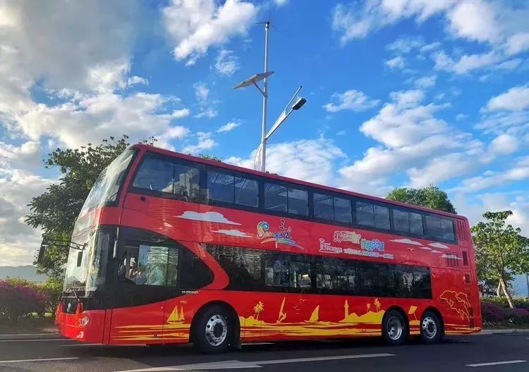 旅游觀光線路配置10輛12米級純電動旅游觀光雙層巴士,車輛外觀設計圖案以紅色為主色調,突出三亞的溫暖與熱情?! ?/span>