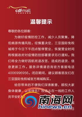 海南旅游頭條、南海網(wǎng)、南海網(wǎng)客戶端三亞1月26日消息(南海網(wǎng)記者 劉麗萍)1月26日,三亞國際免稅城發(fā)出“溫馨提示”:1月26日下午4點暫停營業(yè),恢復(fù)營業(yè)時間將另行通知。三亞國際免稅城在“溫馨提示”中表示,將全力做好因航班退改簽造成的退貨、信息更新工作,服務(wù)詳情可資訊官方客服電話4006996956,閉店期間三亞國際免稅城官方商城正常營業(yè)。