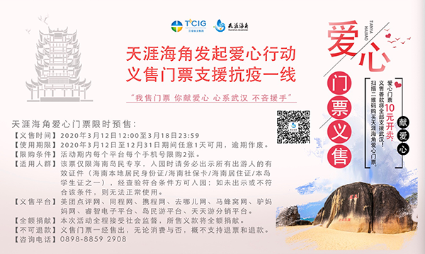 海南旅游頭條、南海網、南海網客戶端、南國都市報海口3月12日消息(記者 鐘瑜)3月12日,三亞市天涯海角游覽區在線發起“天涯海角愛心門票10元義售”活動,以匯聚廣大市民游客的愛心,為武漢抗疫一線送去來自“天涯海角”的關愛與慰問。