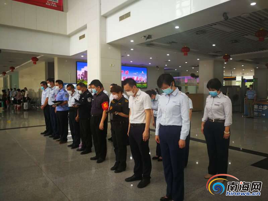 4月4日上午10時許,防空警報和車輛鳴笛聲瞬間響起,在海口汽車客運(yùn)總站候車大廳內(nèi),工作人員和乘客都滿懷沉痛地低頭默哀,30余輛海汽快車一起鳴笛,以此哀悼為新冠肺炎疫情犧牲的烈士和逝世的同胞。(記者王天宇)