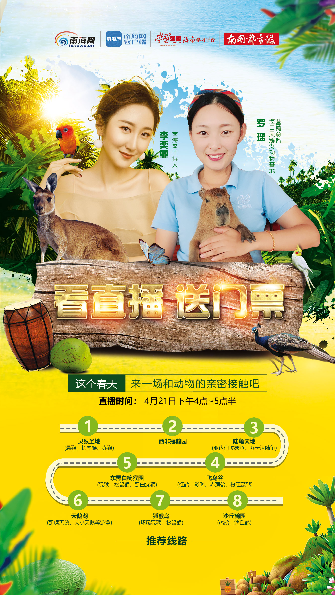 海南旅游頭條、南海網、南海網客戶端、南國都市報海口4月20日消息(記者 程小丹)動物大本營,真正零距離。4月21日下午4點-5點30分,南海網“椰直播”主播奕霏將攜手海口天鵝湖動物基地營銷總監羅瑤,通過手機直播帶網友走進海口天鵝湖動物基地,一起回歸大自然。歡迎廣大網友通過南海網客戶端以及南海網、南國都市報的今日頭條號、抖音號收看直播,參與直播互動還有機會贏取門票,敬請期待!