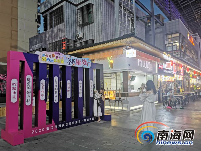 5月3日晚,市民游客在海口市秀英區(qū)尋嘗里夜市的體型測(cè)試門(mén)打卡拍照。記者韓星 攝