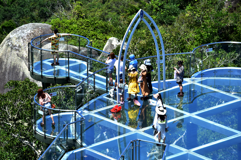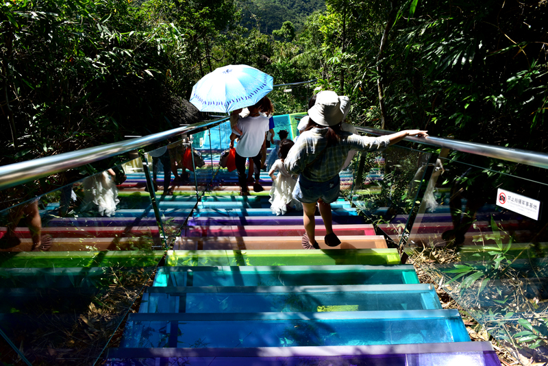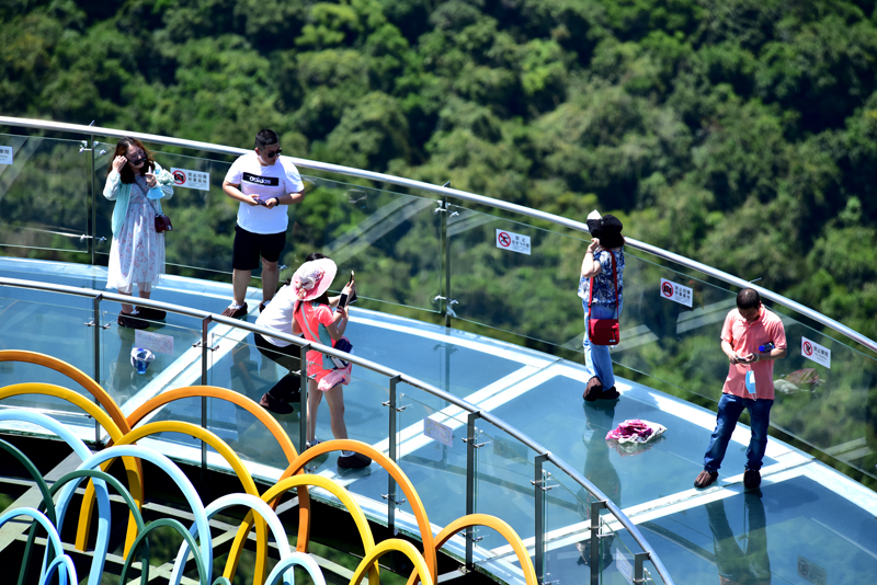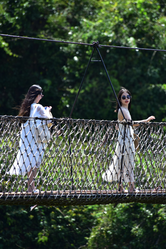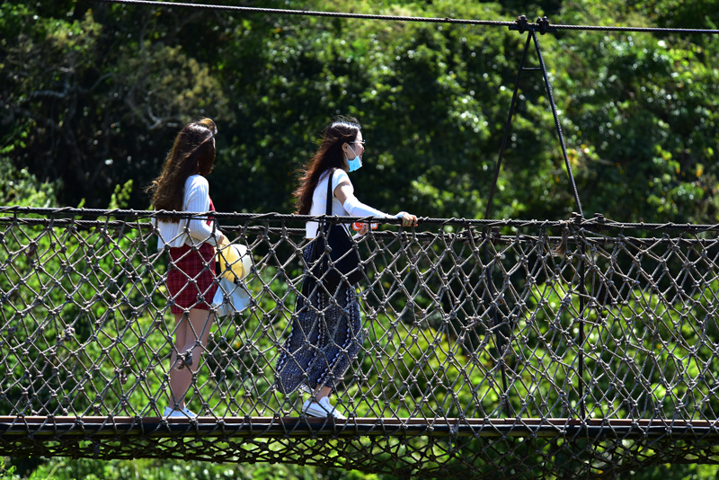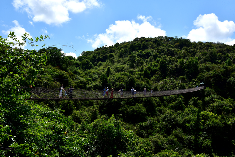 5月15日,炎炎夏日,游客在三亞亞龍灣熱帶天堂森林旅游區(qū)避暑納涼,體驗熱帶雨林清涼之旅的景象。(黃慶優(yōu)攝)