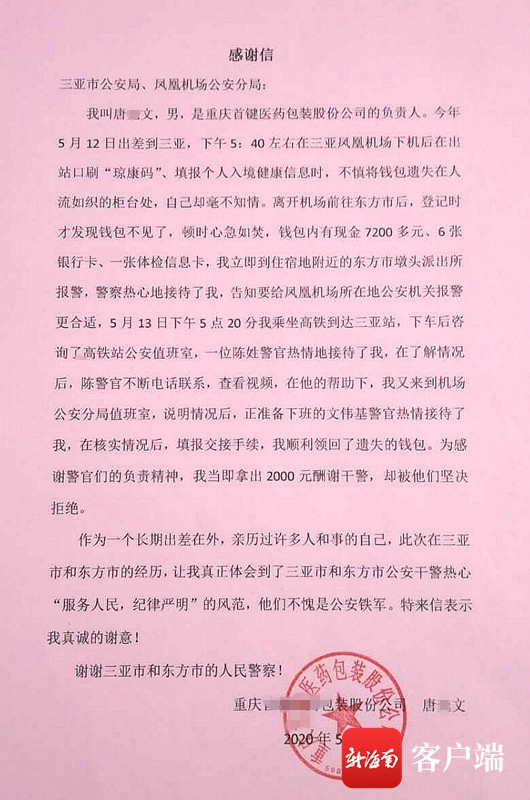 新海南客戶端、南海網(wǎng)、南國都市報5月23日消息(記者 利聲富 通訊員 何岸樺)日前,三亞市公安局鳳凰機場分局候機樓派出所民警熱心幫游客唐先生找回7000多元現(xiàn)金及銀行卡等物品,婉拒唐先生2000元酬謝。為感謝民警,唐先生寫了一封感謝信給他們,表達他的謝意。