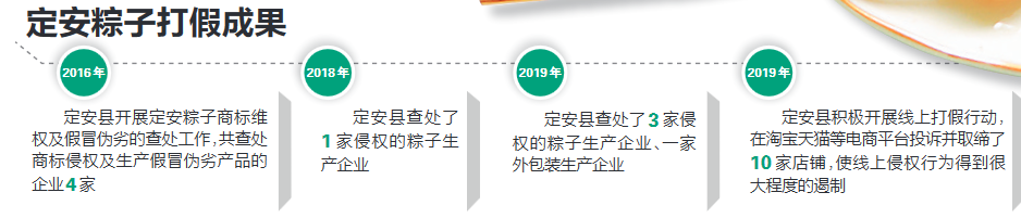利用定安縣政府每年舉辦的海南(定安)端午美食文化節的契機,全方位向消費者展示定安粽子的商標文字和圖案,加強消費者對定安粽子商標認知度,提高消費者辨別真偽的能力;