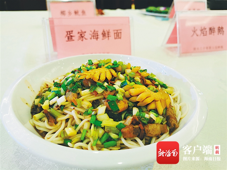 疍家海鮮面以五花肉、蝦仁、墨魚、雞蛋為主要食材,輔以秘制海鮮醬、蝦油,再搭配韭黃、芹菜、韭菜、木耳等,是一款獨(dú)具風(fēng)味的疍家特色面食。