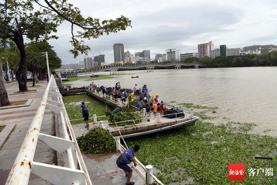 6月17日,工作人員和志愿者在三亞河畔打撈水浮蓮。記者 沙曉峰 攝