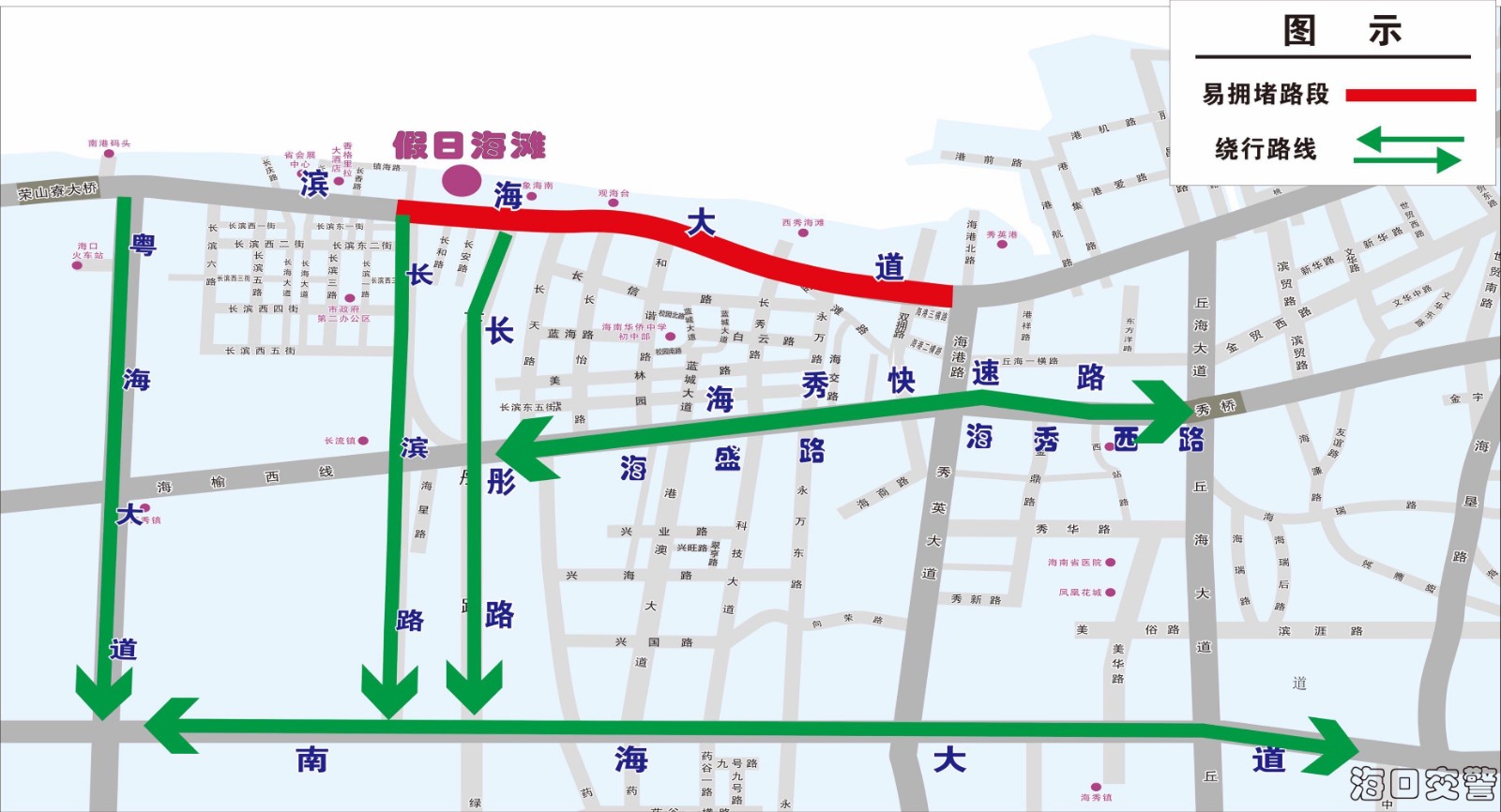 2、當天交警部門將視車流量適時交通管制疏導,如濱海大道假日海灘、觀海臺路段交通流量將會增多,請東往西方向途經車輛繞行海秀快速路、海秀西路→海盛路、南海大道;西往東方向從粵海大道、長濱路、長彤路繞行南海大道、海秀快速路、海盛路→海秀西路返回市區。