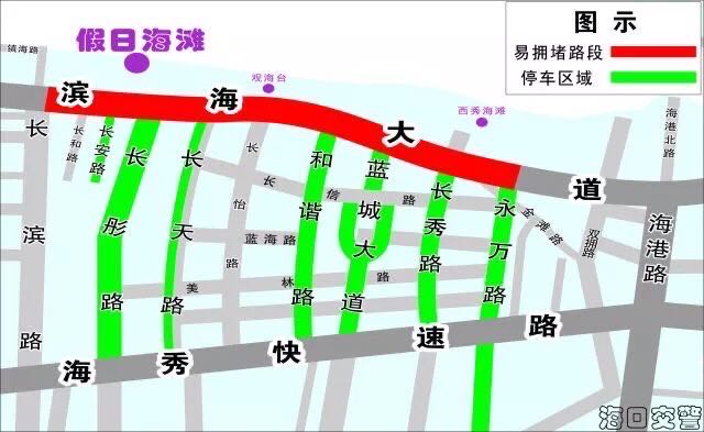 4、在假日海灘、燒烤園車位停滿后,請廣大駕駛人配合現場民警的指揮管理,將車輛臨時停放在濱海西延線南側的永萬路、長秀路、藍城大道、和諧路、長彤路、長天路、長安路等道路。
