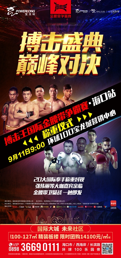搏擊王金腰帶爭霸賽海口站賽前稱重儀式將在環(huán)球100寶龍城營銷中心舉辦。