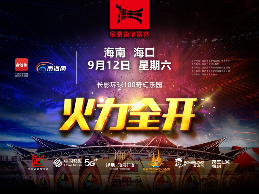 搏擊王金腰帶爭霸賽海口站將于9月12日在長影環(huán)球100奇幻樂園打響。