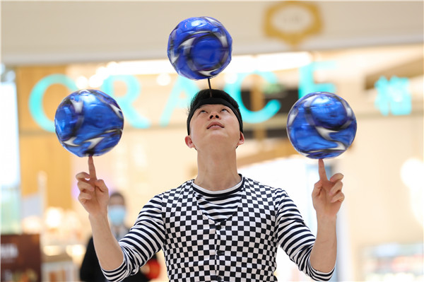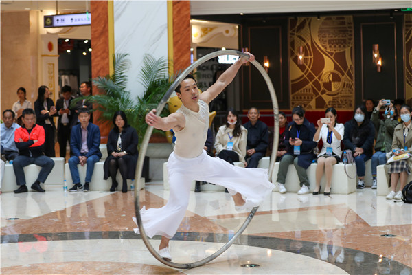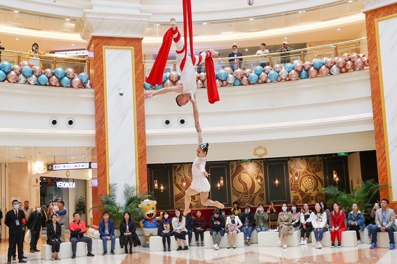 在太陽大廳的超高穹頂之下,采風團欣賞了環球港演繹團隊帶來的一場視覺盛宴,空中綢吊、新疆歌舞、花式足球......據了解,“天天演藝秀”全年365天不停歇,其演員均是“黃金100秒”、”星光大道”、”中國達人秀”的冠軍演員,得到了周邊社區居民的廣泛關注和長期喜愛。