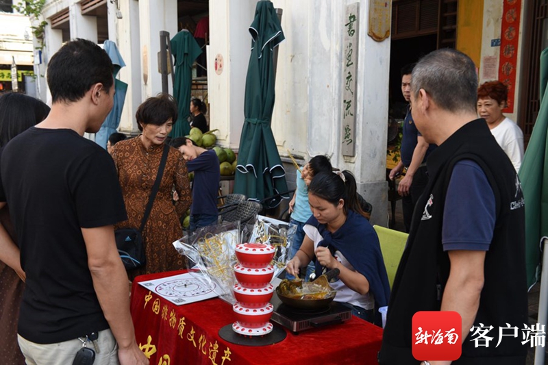 不少騎樓老街的店鋪商家?guī)е髯缘恼信粕唐穪淼浆F(xiàn)場,向市民游客做品牌推介;從興隆小鎮(zhèn)來的南洋風(fēng)味美食打開了大家的味蕾:斑斕七層糕、娘惹雙色粽、印尼千層糕、蕉葉糯米條、椰絲木薯球等特色小吃讓人食指大動。