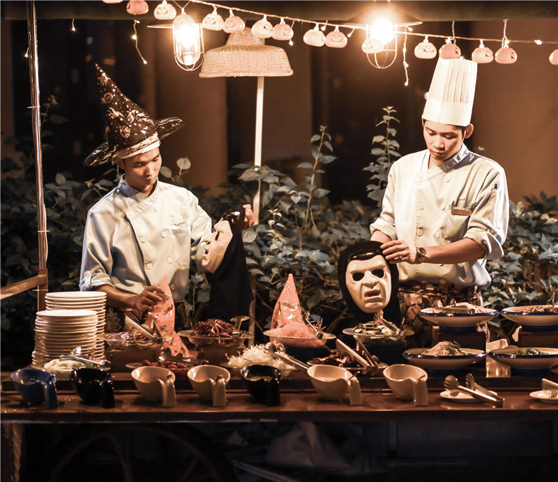 在這個(gè)充滿鬼魅氣息的夜晚,加勒比海燒烤園進(jìn)行了一番充滿光怪陸離的萬圣節(jié)主題裝飾。充滿各種詭異表情的裝飾、傳統(tǒng)萬圣節(jié)菜肴和甜品飲料,讓賓客目不暇接、大飽口福。新鮮現(xiàn)開現(xiàn)烤生蠔、日式料理檔、清蒸冰鎮(zhèn)海鮮檔、BBQ燒烤檔和各式生猛海鮮,應(yīng)有盡有。席間更有喬裝打扮的酒店工作人員活躍于賓客之間,各路“鬼怪”傾巢出動(dòng),為賓客們奉上一場(chǎng)難忘的“貪吃鬼行動(dòng)”盛宴。