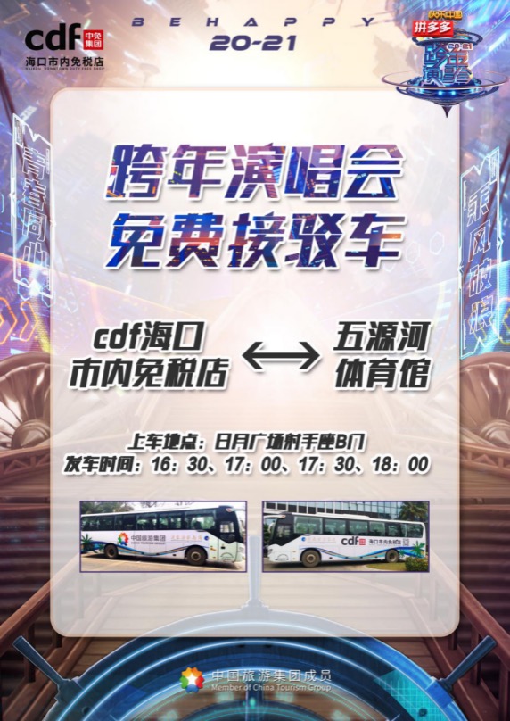 活動期間,cdf海口市內免稅店準備接駁車服務,演唱會觀眾可于12月31日16:30、17:00、17:30、18:00,前往cdf海口市內免稅店(射手座B門)搭乘專車至五源河體育館,演出結束后通過現場乘坐指引返回市內。