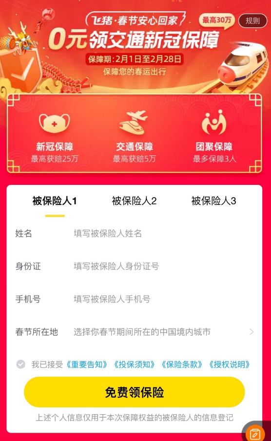 為保障春運安心出行,飛豬推出0元領交通新冠保障服務,中國境內飛機火車汽車全涵蓋,保障期覆蓋整個2月份。不論是否在飛豬平臺購票,只要打開飛豬App搜索“春運保障”均可直達領取頁面,單人最高保障30萬元,最多可保障3人。
