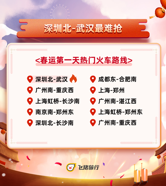 從飛豬平臺的火車票發售和預約情況看,最先進入春運狀態的是武漢站、深圳北、廣州南、上海虹橋、南京南、北京西和北京南,預訂1月28日出發前往全國各地的火車票數量最多。