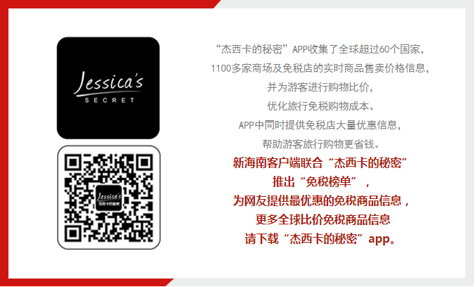 基于全球比價(jià)APP“杰西卡的秘密”百萬用戶周期內(nèi)點(diǎn)擊熱門商品排名,新海南聯(lián)合“杰西卡的秘密”推出“最受關(guān)注免稅品榜單”,在未來的日子里,將會(huì)以“周榜單”和“月榜單”和大家見面~