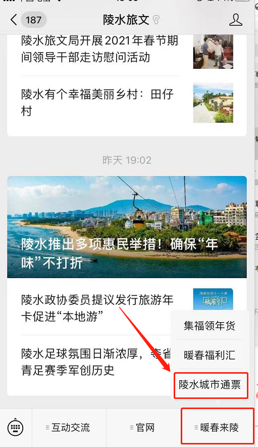 購買陵水城市通票方法:進入“陵水旅文”微信公眾號,點擊導航欄右下角“暖春來陵”,點擊“陵水城市通票”,即可進行預訂窗口。