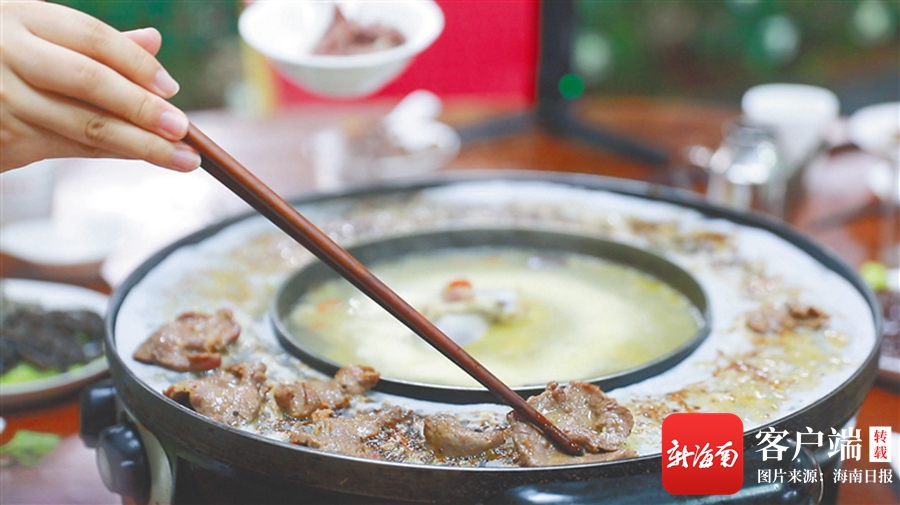 定安最流行的牛肉吃法是用子母鍋,可以煎也可以涮。中間的子鍋烹煮著清甜的牛肉高湯,用來涮牛肉。外圈的母鍋被鋪上一層燒烤紙,用來煎烤牛肉。因為吃法不同,切出來的牛肉也不一樣,用來煎的牛肉要切成薄片,用來煮的牛肉略帶肥花,成條塊狀。切成薄片的牛肉用醬料腌過,在煎鍋上兩邊煎至變色,蘸上店家特制的什錦醬,牛肉入口彈牙,那感覺就兩個字:鮮和嫩。