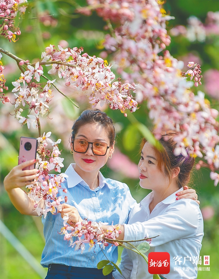 “快看,這里的櫻花開得多旺!快幫我在樹下拍張照?!?4月5日,在儋州市蘭洋鎮的藍洋櫻花樂園,熱帶櫻花競相綻放,粉色的花浪隨風而動,專程從海口前來的游客王蕾和朋友興奮地拍照“打卡”。
