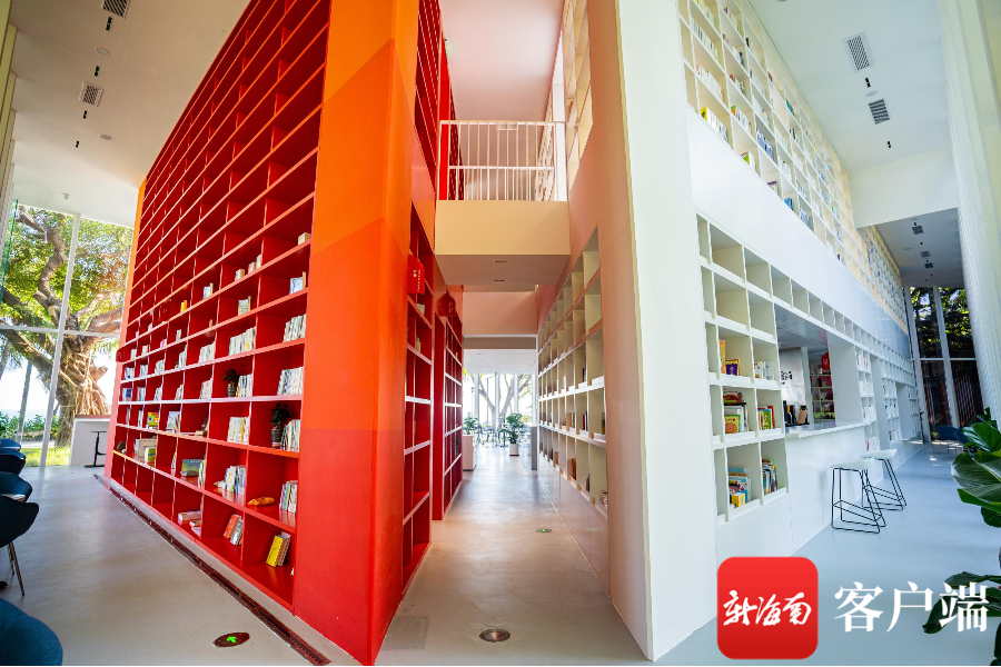天涯書局為全玻璃幕墻結構,可360°透視觀景。從外向內看,紅色漸變書架如火焰,白色書架如冰山,充滿幾何美感的三角形立面透過玻璃幕墻和椰林樹影,隱隱地吸引著游客的目光。書局室內分為兩層,面積近450平方米,目前收納有圖書1800種,近兩萬冊,被營造成極具生活美學的復合型文化空間,集結了主題書店、創客空間、藝術長廊、創意市集、咖啡輕食、手工藝坊、親子空間、場地服務等功能于一體,在這里可以舉辦面對面的讀書交流、分享、文學沙龍、現場脫口秀、電影放映等活動,也可以看書、喝咖啡、看景、發呆,從內向外看,室外的浪漫海景觸手可及。