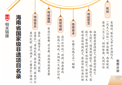 非物質(zhì)文化遺產(chǎn)作為文化遺產(chǎn)中的活態(tài)部分,凝結(jié)、保留和傳遞著一個民族的歷史記憶。海南的非遺資源極具海島特色,又呈現(xiàn)海陸相接、多元共生的特點,具有極為豐厚的文化內(nèi)涵。海南非遺文化眾多,民間文學(xué)類有瓊僑歌謠、海南諺語(臨高漁諺)等省級非遺;傳統(tǒng)音樂類有儋州調(diào)聲、崖州民歌、疍歌、海南八音器樂等國家級、省級非遺;傳統(tǒng)舞蹈類有黎族打柴舞、老古舞、海南苗族盤皇舞、盅盤舞等國家級、省級非遺;傳統(tǒng)戲劇類則有木偶戲、瓊劇、海南公仔戲等國家級、省級非遺;傳統(tǒng)技藝類有黎族原始制陶技藝、黎族傳統(tǒng)紡染織繡技藝、海鹽曬制技藝、文昌雞養(yǎng)殖與烹調(diào)技藝等國家級、省級非遺;民俗類也有黎族三月三節(jié)、南海航道更路經(jīng)、祭祀兄弟公出海儀式、冼夫人信俗、府城元宵換花節(jié)等國家級、省級非遺。